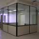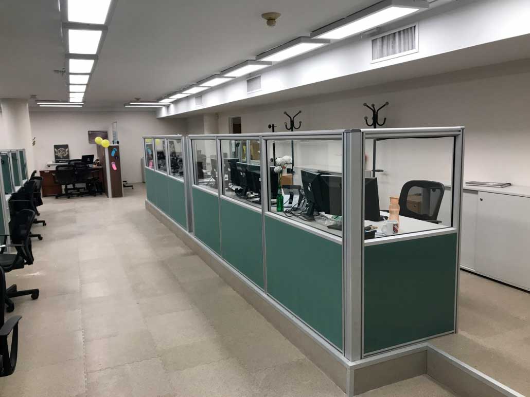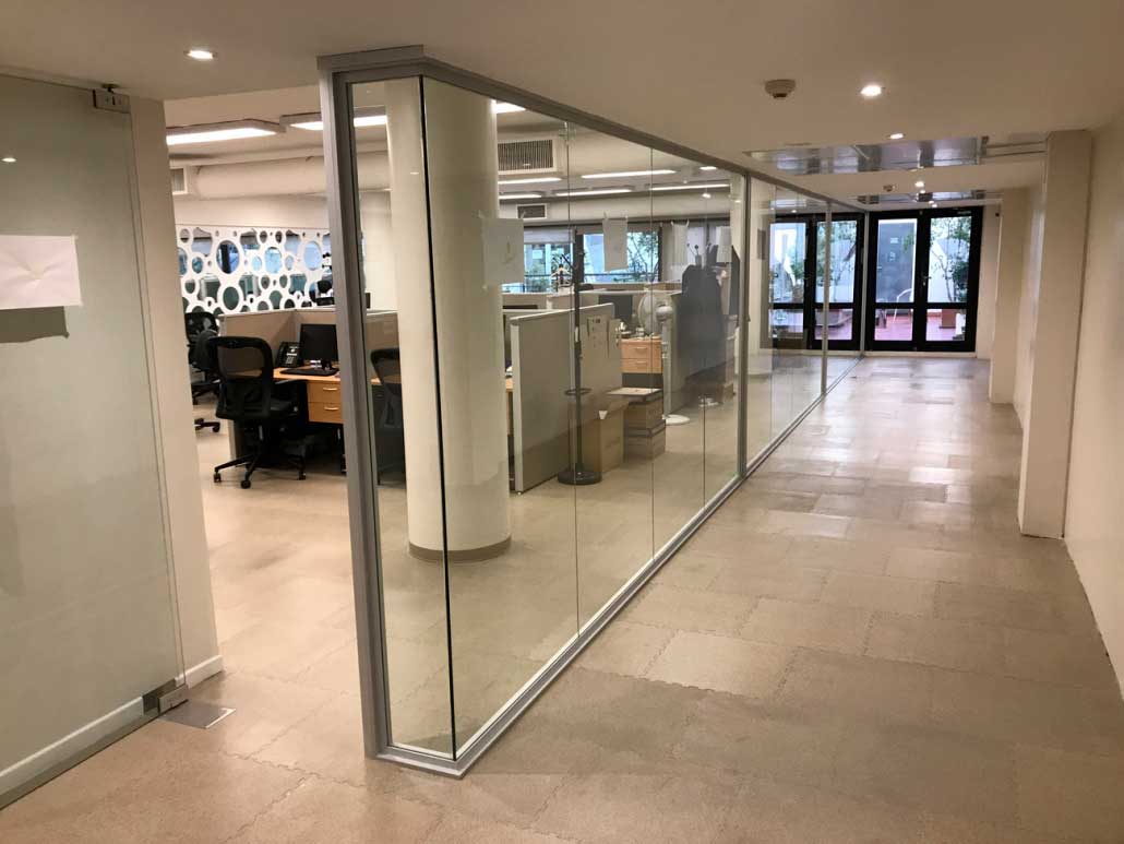 • Construcción de tabique de placas de yeso, paño fijo con perfil “U” de aluminio, vidrio laminado 3+3mms con borde pulido y mdf ruteado a medida, aproximadamente 18mts2.