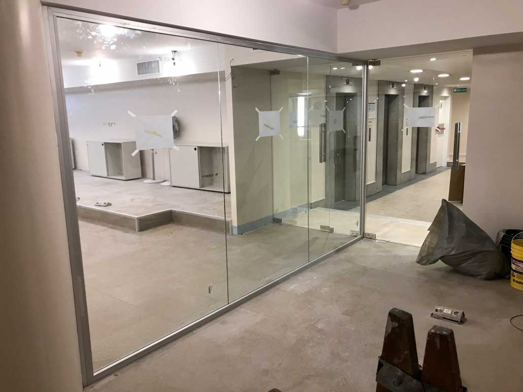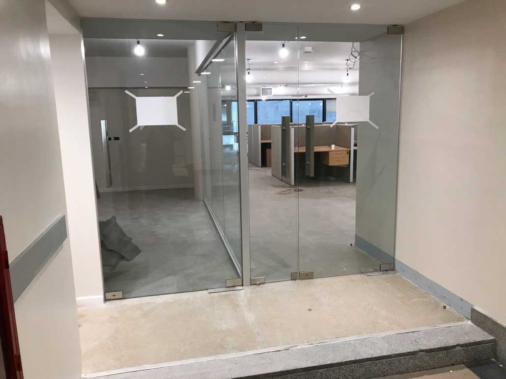 • Provisión y colocación de 4 puertas de vidrio templado, con caja de freno, cerradura inferior y barral de acero inoxidable cuadrado.