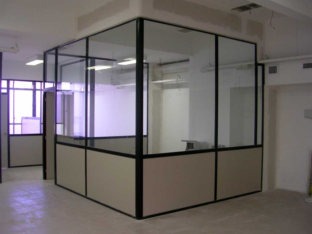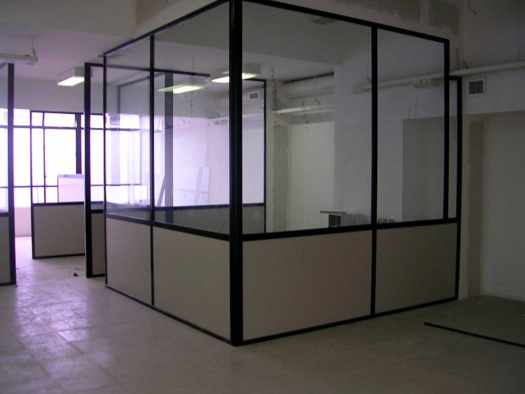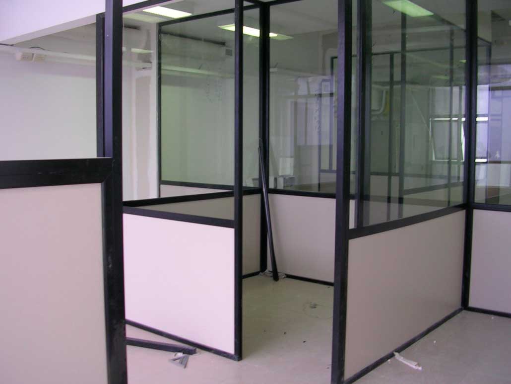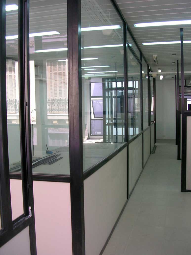 Participamos en el armado de las oficinas de un sindicato a fines de 2008 con la fabricación y colocación de tabiques de aluminio línea modena pintado negro contra vidrios curvos, panel superior vidrios laminados 3+3mms y panel inferior melamina aglomerada almendra 18mms.