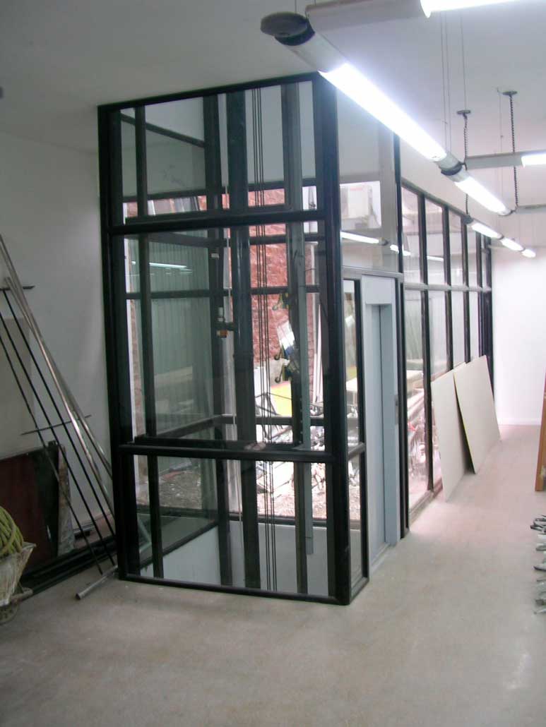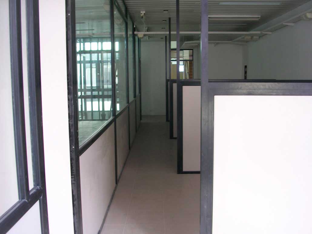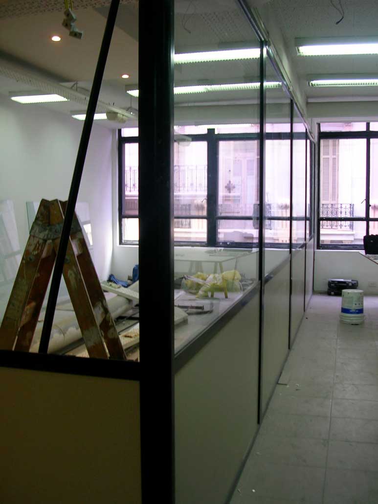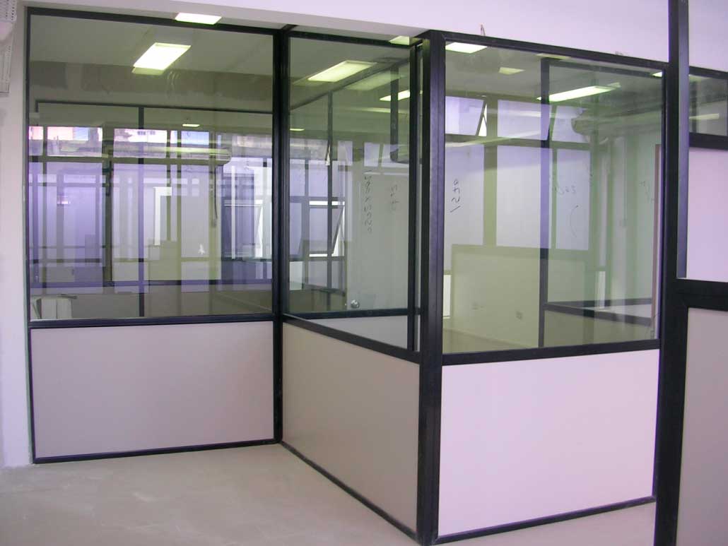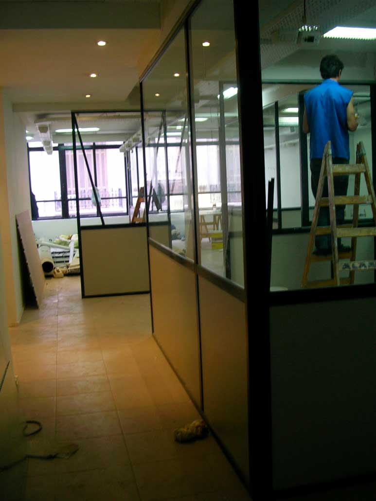 Participamos en el armado de las oficinas de un sindicato a fines de 2008 con la fabricación y colocación de tabiques de aluminio línea modena pintado negro contra vidrios curvos, panel superior vidrios laminados 3+3mms y panel inferior melamina aglomerada almendra 18mms.